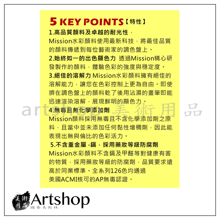Mission水彩顏料不含鎘及甲醛等對身體有害的物質,