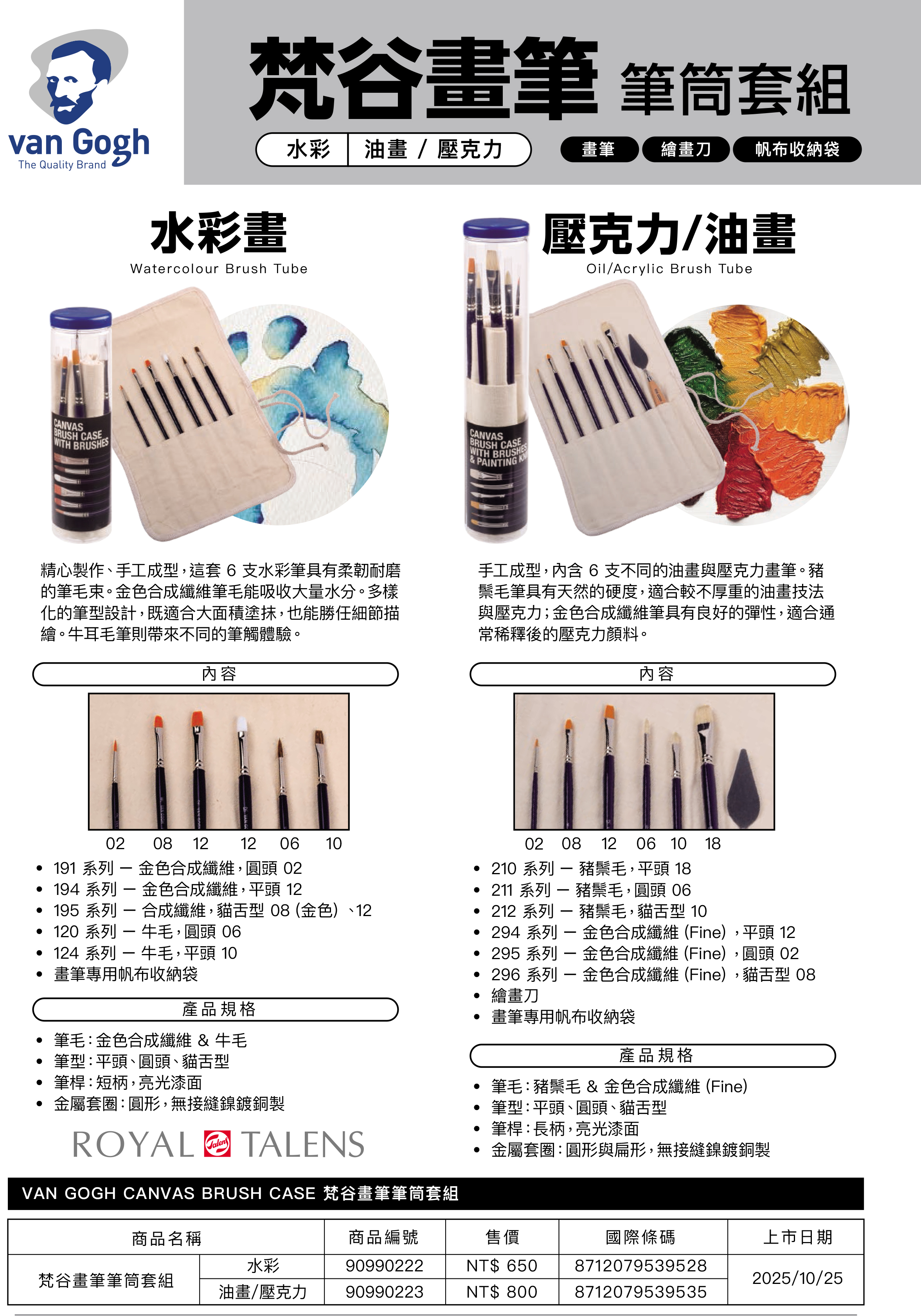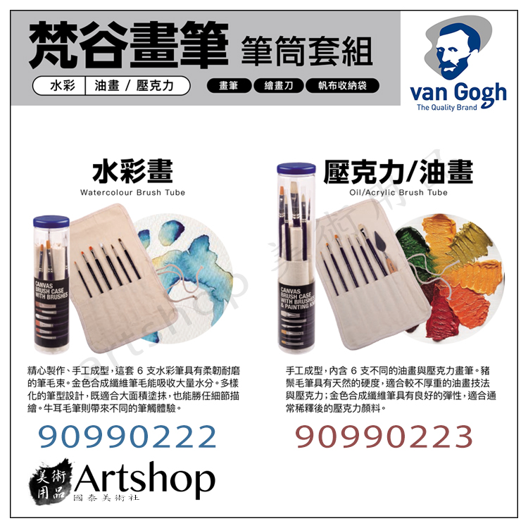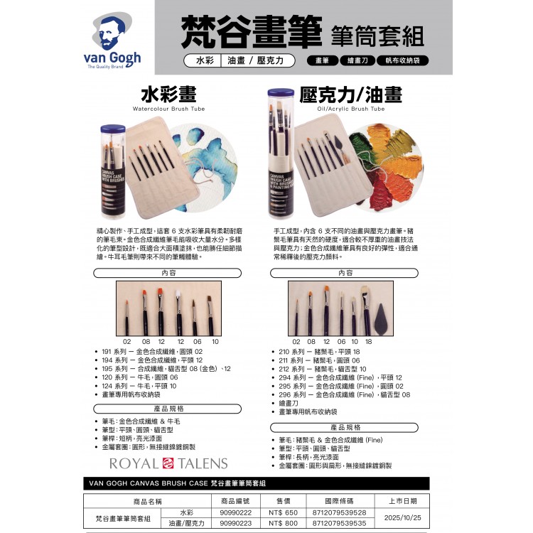 - 型號: 荷蘭 Van Gogh 梵谷 水彩筆套組/壓克力/油畫筆套組 6支入